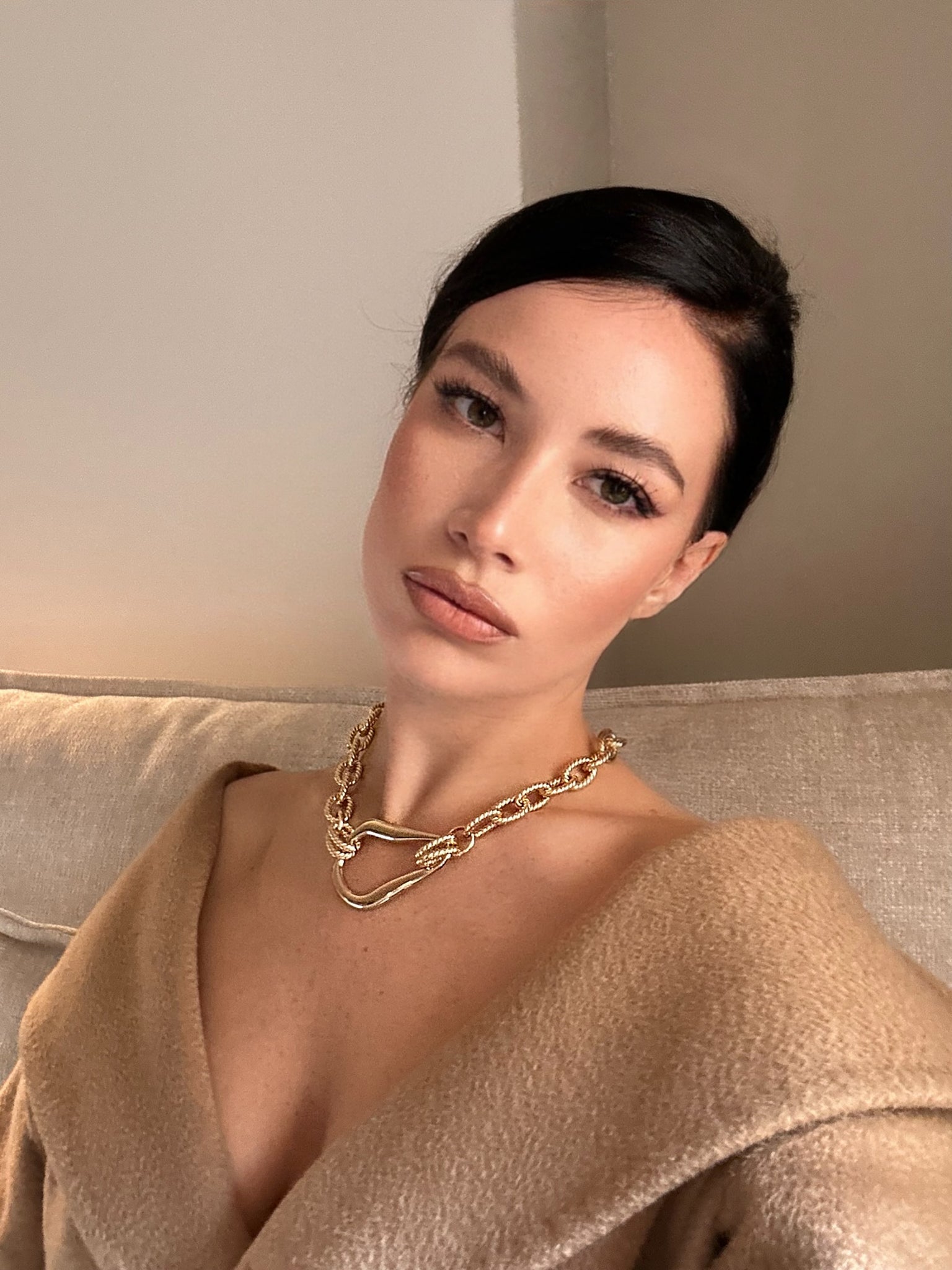 Collana catena in metallo zigrinato ed elemento centrale in oro lucido.