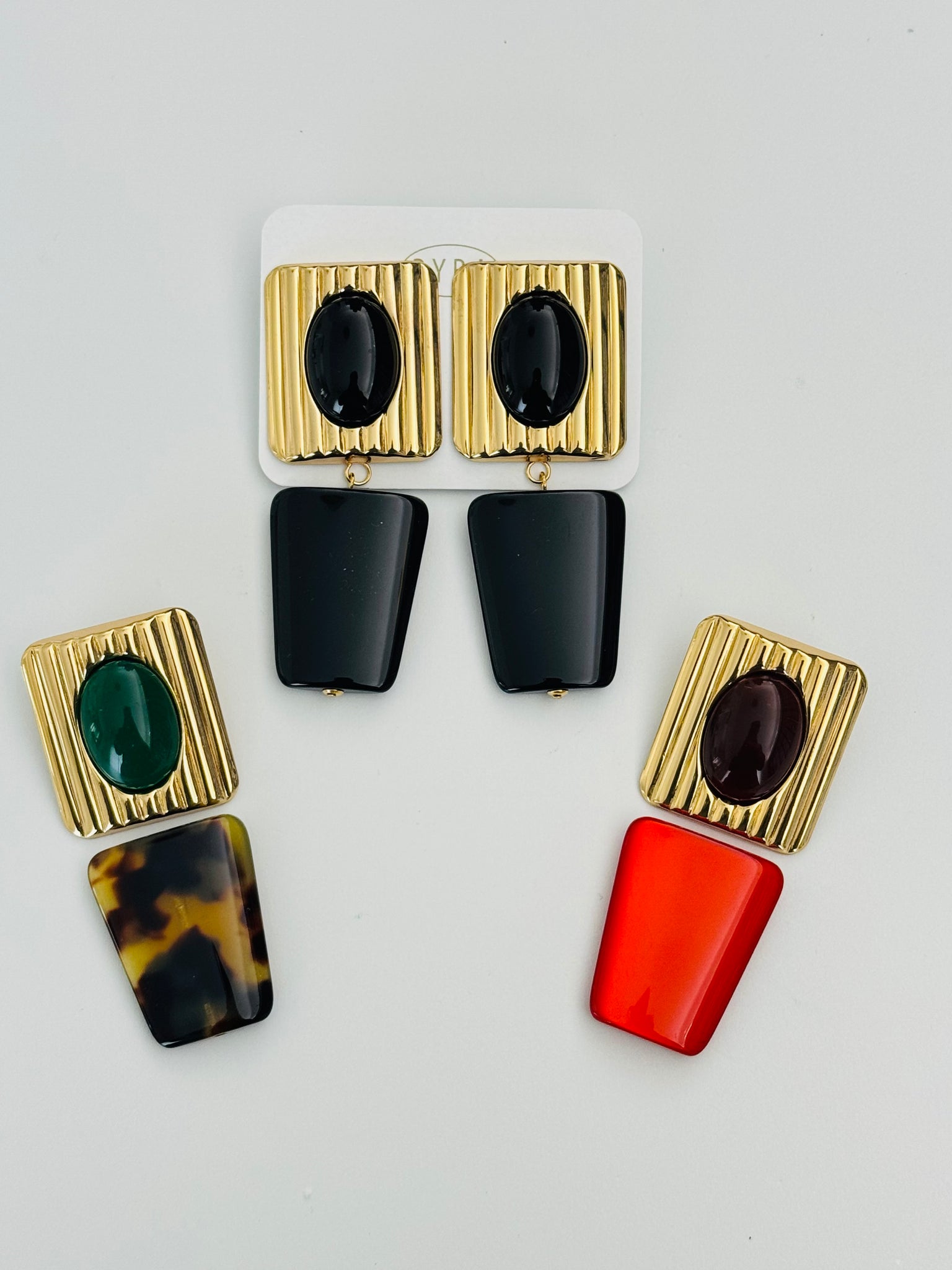 Orecchini a buco leggerissimi  in ottone dorato , cabochon e pendente in resina