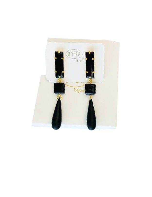 Orecchini a buco cristalli neri e pendente goccia in resina nera satinato e metallo oro