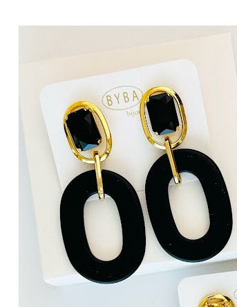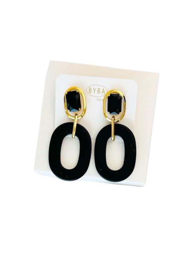 Orecchini a buco cristalli neri e pendente ovale in resina nera satinato e metallo oro