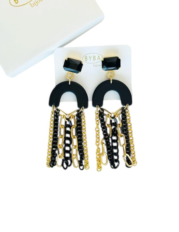 Orecchini a buco cristalli neri e pendente ovale in resina nera satinato e metallo oro